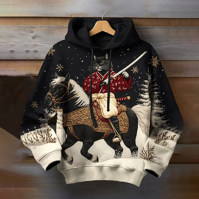 Men's Christmas Black Cat Warrior Print Hoodie