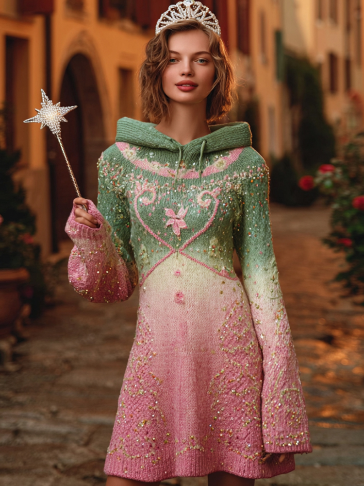 2025 Witch Princess Gradient Women's Knit Hooded Fitted Mini Dress