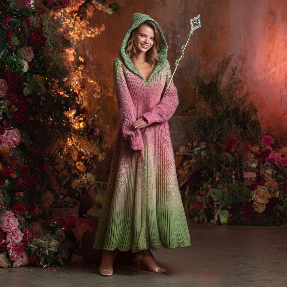 2025 Witch Gradient Women's Knit Hooded A-line Midi Dress
