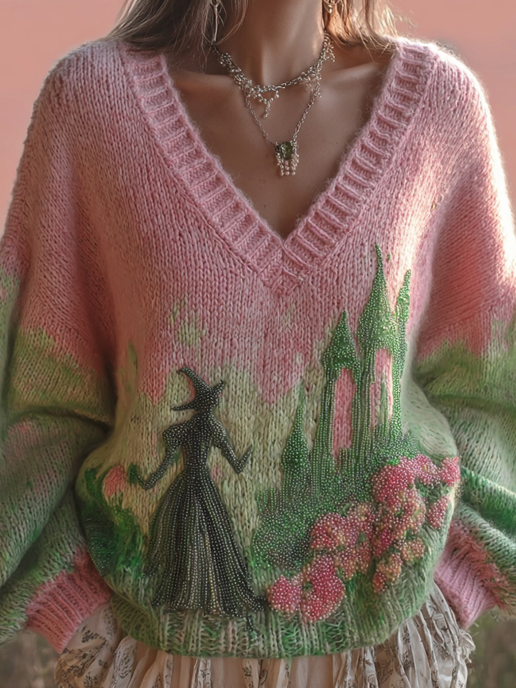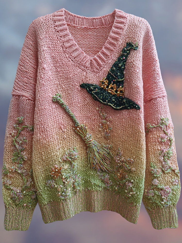 Halloween 2025 Witch Beads Embroidered V Neck Sweater