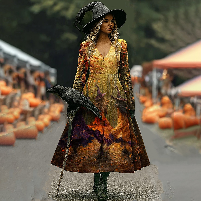 Women's Halloween Art Print V Neck Long Sleeve Maxi Dress