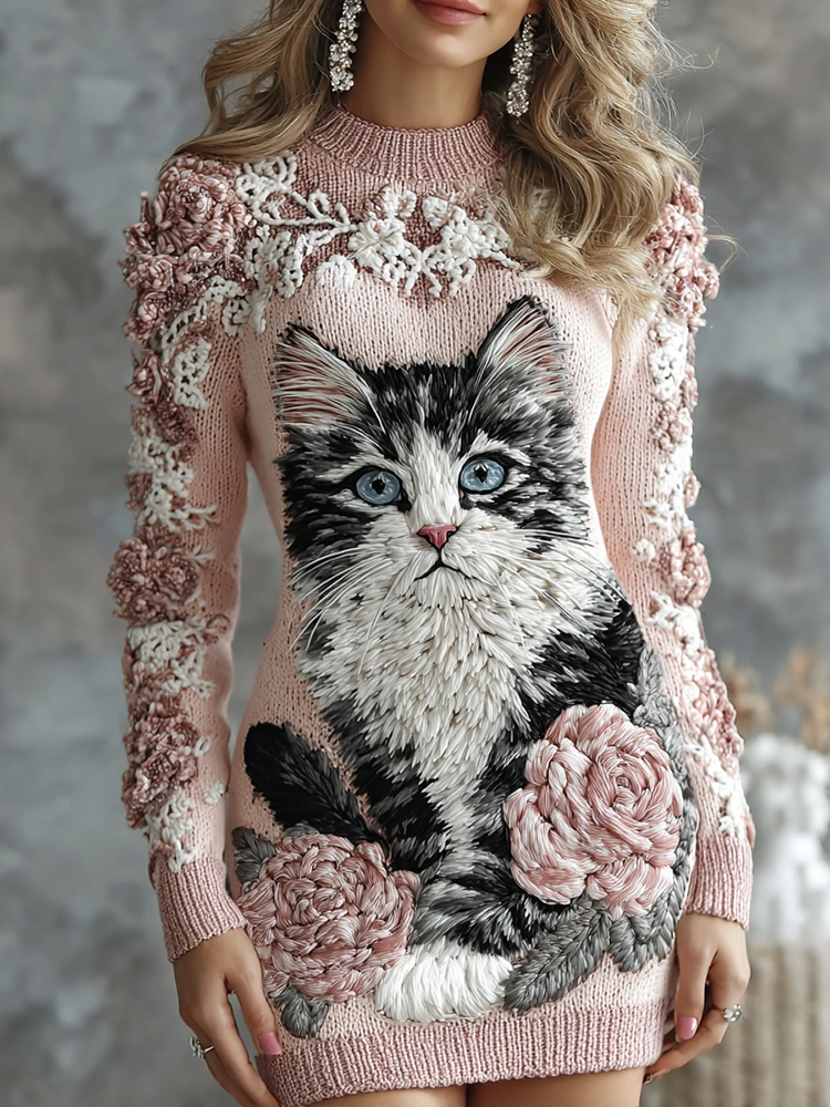 Women's Cute Cat With Rose Art Cozy Knit Mini Sweater Dress