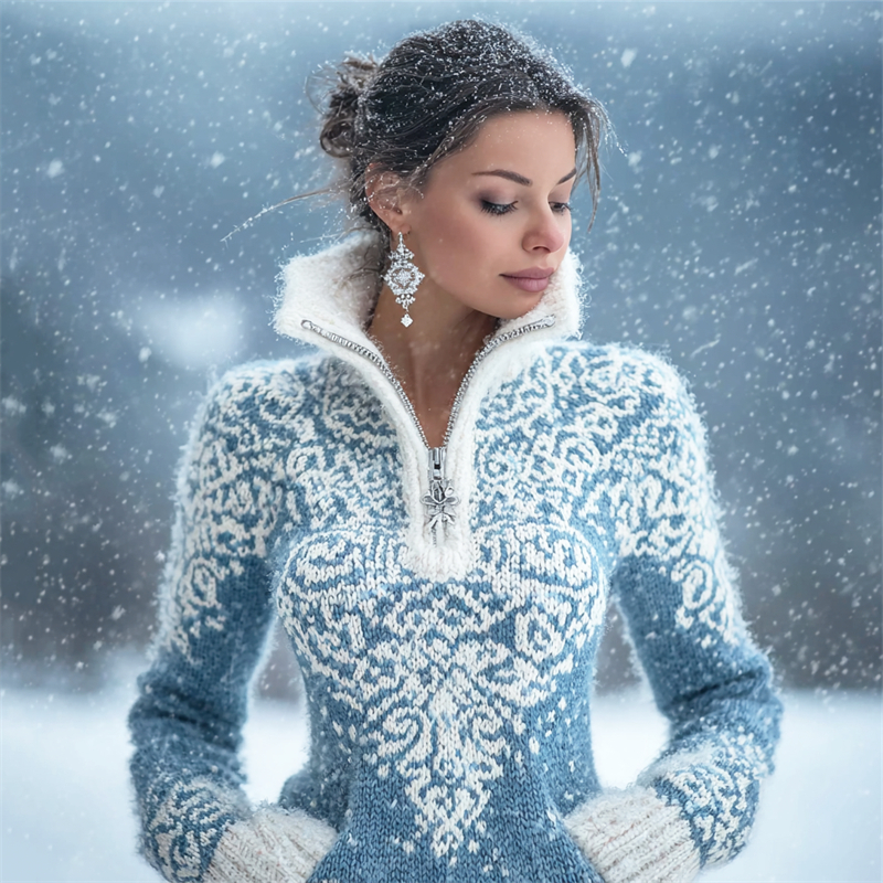 Snowflakes Inspired Celtic Contrast Cozy Knit Zip Up Sweater