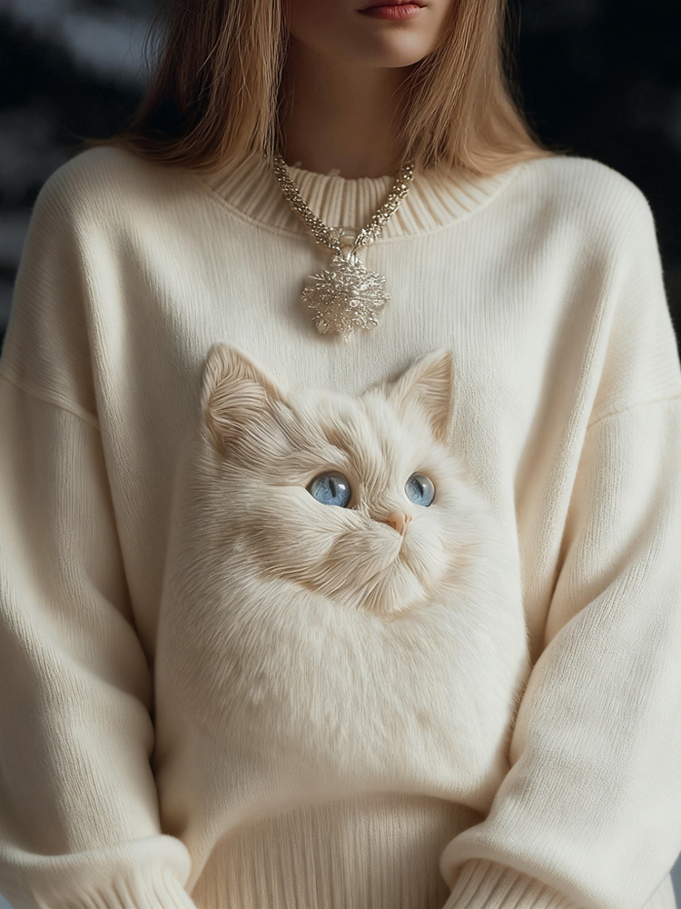 Lovely Fuzzy Cat Embroidered Round Neck Cozy Knit Sweater